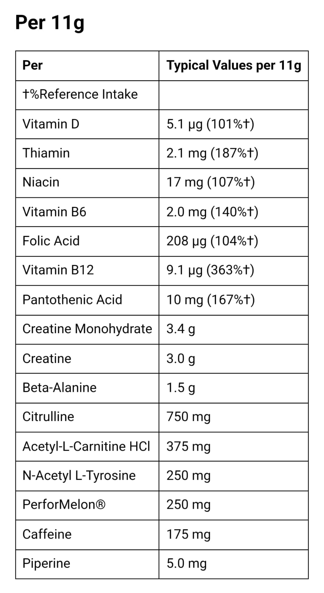 Creatine Monohydrate, Beta-Alanine, Acids (Citric Acid, Malic Acid, L(+)-Tartaric Acid), Flavourings, Anti-Caking Agents (Calcium Silicate, Silicon Dioxide), L-Citrulline, Colours (Beetroot Red, Beta-Carotene, Curcumin), Acetyl-L-Carnitine Hydrochloride, Thickeners (Sodium Carboxy Methyl Cellulose, Xanthan Gum, Carrageenan), N-Acetyl-L-Tyrosine, Pyridoxine Hydrochloride, PerforMelon(R) Watermelon Extract (Citrus lanatus, fruit), Natural Caffeine, Sweeteners (Sucralose, Acesulfame K), Nicotinamide, Calcium D-Pantothenate, Cyanocobalamin, Black Pepper Extract (Piper nigrum, fruit), Pteroylmonoglutamic Acid, Thiamin Hydrochloride, Cholecalciferol. The product is made in a factory which handles milk, gluten, egg, soy, nuts & peanut the product is its not '100% vegan product' Always read the label before use.