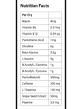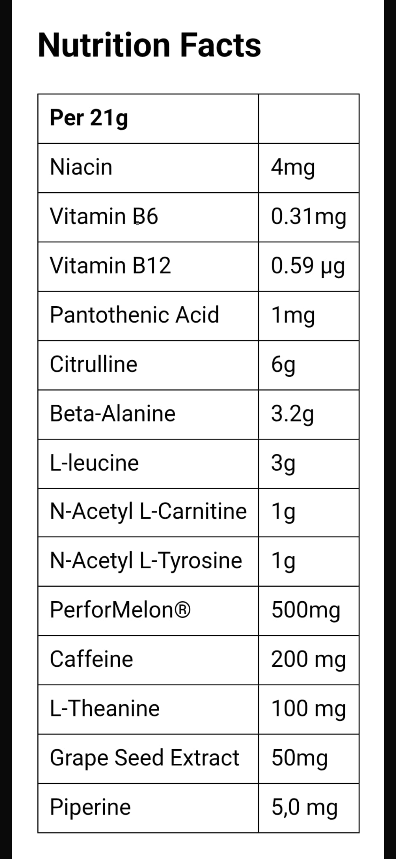L-citrulline, beta-alanine, L-leucine, flavourings, anti-caking agents (calcium silicate, silicon dioxide), acids (citric acid, malic acid, L-tartaric acid), N-acetyl L-carnatine, N-acetyl L-tyrosine, colours (beetroot red, carotenes, curcumin), PerforMelon®️ watermelon juice powder, sweeteners (acesulfame K, sucralose), natural caffeine, L-theanine, grape seed extract (Vitis vinifera L.), pyridoxine hydrochloride (vit. B6), black pepper extract (Piper nigrum L.), nicotinamide (vit. B3), calcium D-pantothenate (vit. B5), cyanocobalamin (vit. B12)
