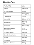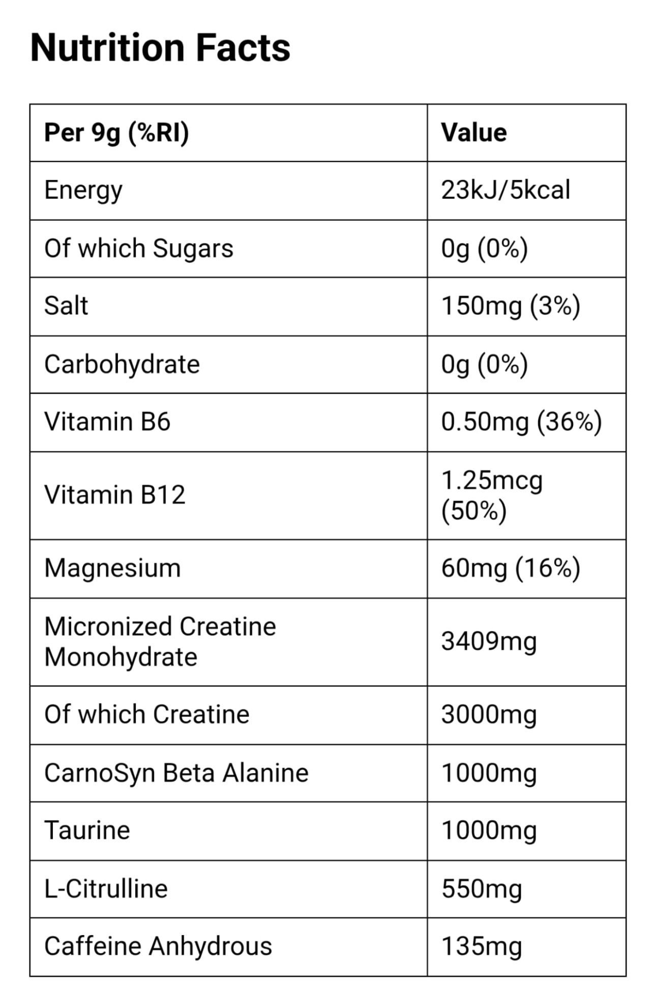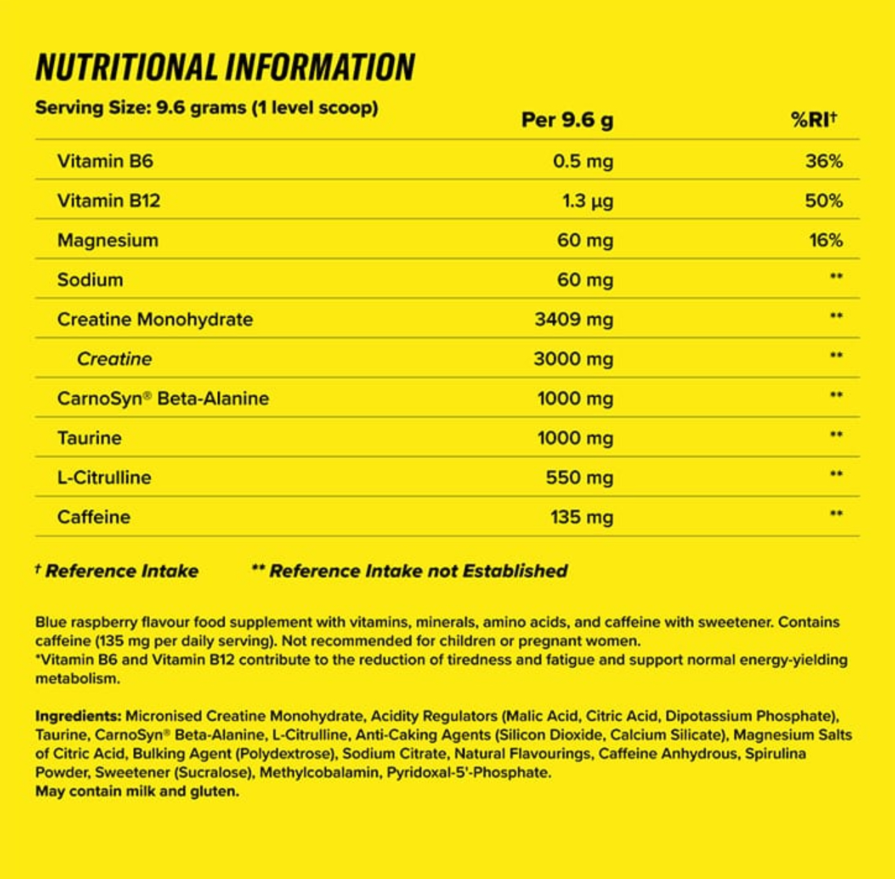 Micronised Creatine Monohydrate, Acidity Regulators (Malic Acid, Citric Acid, Dipotassium Phosphate), Taurine, CarnoSyn®️ Beta-Alanine, L-Citrulline, Anti-Caking Agents (Silicon Dioxide, Calcium Silicate), Magnesium Salts of Citric Acid, Bulking Agent (Polydextrose), Sodium Citrate, Natural Flavourings, Caffeine Anhydrous, Spirulina Powder, Sweetener (Sucralose), Methylcobalamin, Pyridoxal-5'-Phosphate.