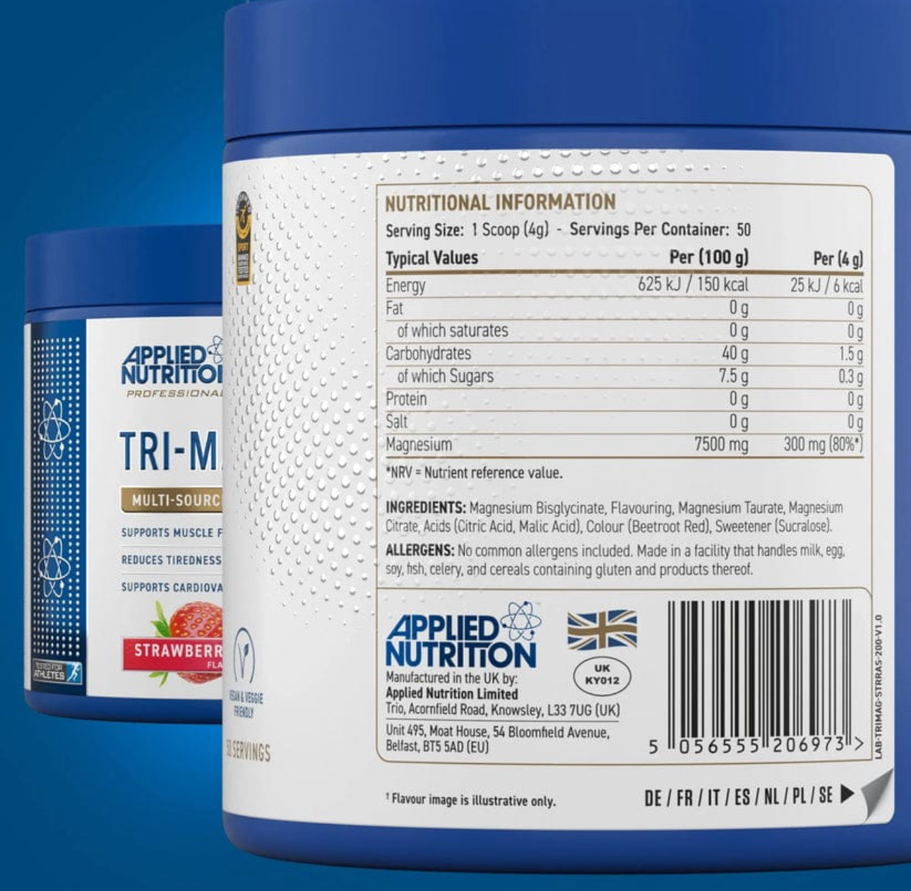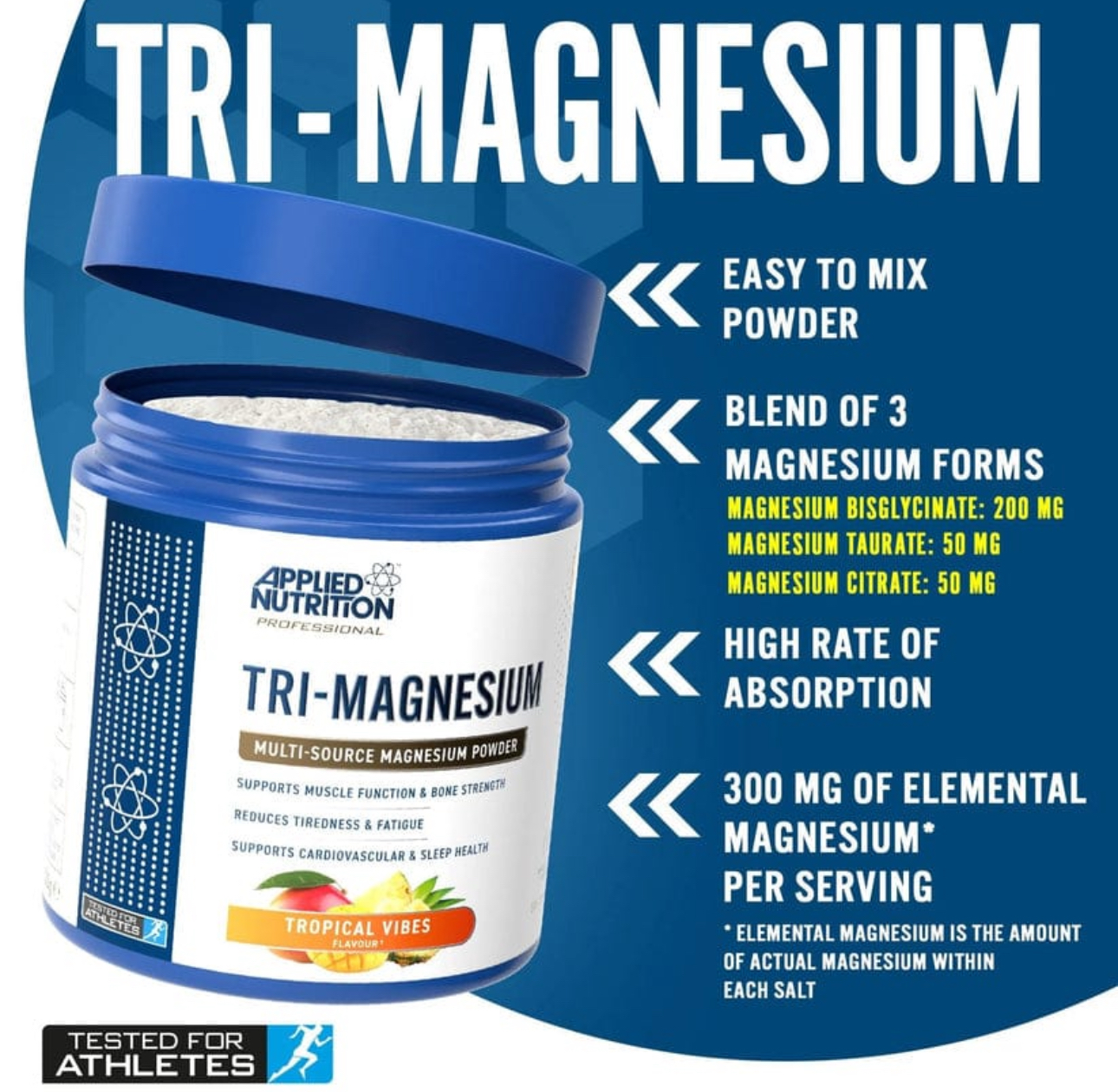 Applied Nutrition Tri-magnesium Powder is a high-quality supplement designed to provide a comprehensive and highly bioavailable magnesium blend. Featuring three forms of magnesium: Magnesium Bisglycinate, Magnesium Citrate, and Magnesium Taurate, this powder ensures optimal absorption and effectiveness. Ideal for individuals seeking to support muscle function, improve sleep quality, and maintain overall health.